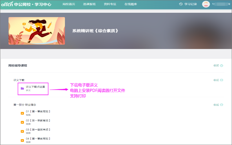 操作指南:請登錄學(xué)習(xí)中心(xue.eoffcn.com ),通過課程列表進(jìn)入課程大綱目錄,點(diǎn)擊講義下載即可(詳見下圖)