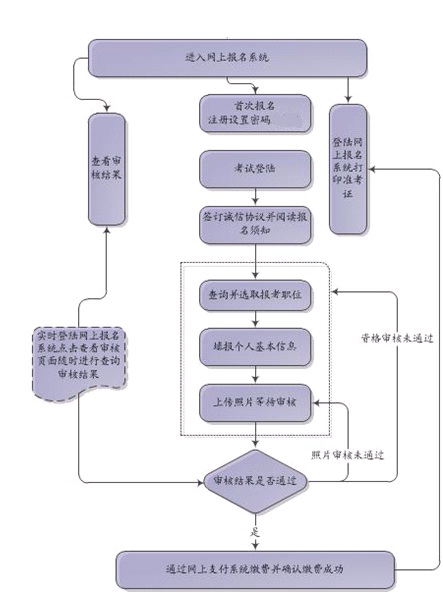 登錄報(bào)名網(wǎng)站—>閱讀并同意考生誠(chéng)信承諾—>進(jìn)入報(bào)名界面按報(bào)名系統(tǒng)提示填寫(xiě)報(bào)名信息—>上傳近期清晰免冠電子照片—>等待報(bào)名資格審核—>審核通過(guò)后網(wǎng)上繳費(fèi)。