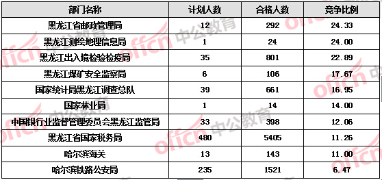 為幫助廣大考生更清晰的了解今日報名情況,黑龍江中公教育整理了審核通過人數(shù)前十位的部門以及競爭比例最激烈的部門,供廣大考生參考: