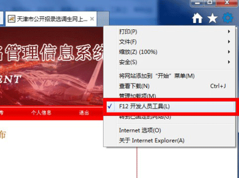 首先:請考生先選擇使用IE瀏覽器,然后選擇IE瀏覽器的兼容模式進(jìn)行網(wǎng)上報(bào)名,不同版本IE瀏覽器設(shè)置方法不同,現(xiàn)以IE10為例:選擇IE10瀏覽器的工具選項(xiàng),然后選擇F12開發(fā)人員工具選項(xiàng),如下圖所示