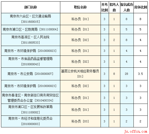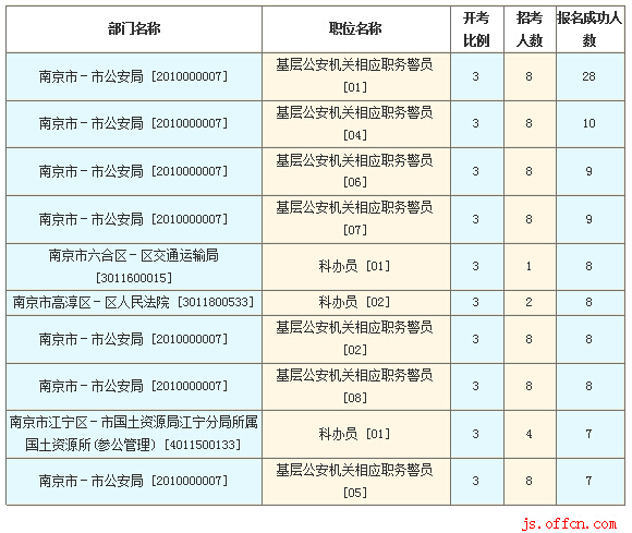 截至11日16時,南京市報名人數(shù)最多的職位為:基層公安機(jī)關(guān)相應(yīng)職務(wù)警員 [01],一共有28人報名,競爭最激烈的職位為科辦員 [01],招錄1人,報名人數(shù)為8人,報名通過審核人數(shù)前十的職位主要集中在南京市-市公安局 [2010000007]、南京市六合區(qū)-區(qū)交通運輸局 [3011600015],具體信息如下: