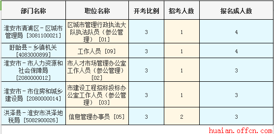 截至11日16時,淮安市報名人數(shù)最多的職位為:區(qū)城市管理行政執(zhí)法大隊執(zhí)法隊員(參公管理) [01]、稅收征管辦事員 [01]、稅收征管辦事員 [02]、工作人員 [09],分別有4人報名,競爭最激烈的職位為工作人員 [09],招錄1人,報名人數(shù)為4人,報名通過審核人數(shù)前十的職位主要集中在淮安市清浦區(qū)-區(qū)城市管理局 [3081100021]、漣水縣-淮安市漣水地稅局 [5082600026],具體信息如下: