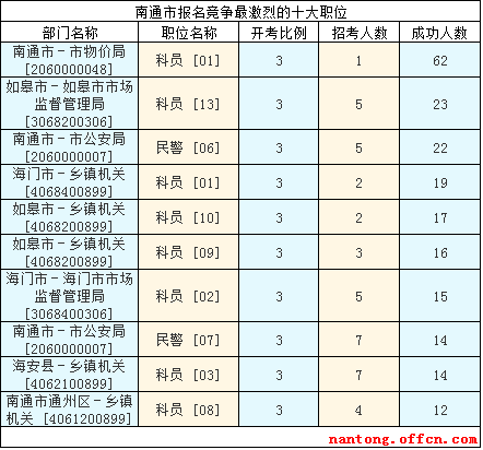 截至11日16時,南通市報(bào)名人數(shù)最多的職位為:科員 [01],一共有62人報(bào)名,競爭最激烈的職位為也是這個報(bào)名最多的科員[01],招錄1人,報(bào)名人數(shù)為62人,報(bào)名通過審核人數(shù)前十的職位比較集中,主要是南通市區(qū)和如皋市,如南通市-市物價局[2060000048]、如皋市-如皋市市場監(jiān)督管理局[3068200306],具體信息如下: