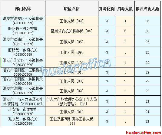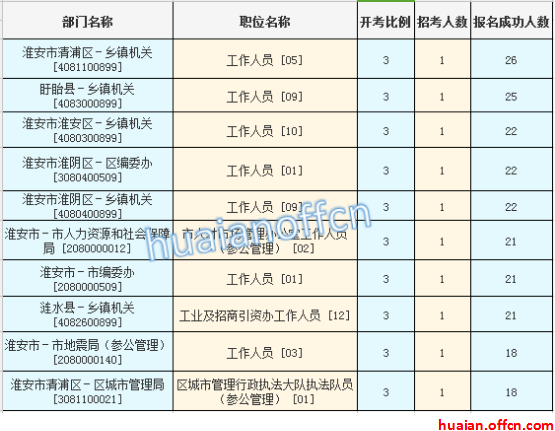 截至13日16時,淮安市報名人數(shù)最多的職位為:工作人員 [09],一共有38人報名,競爭最激烈的職位為工作人員 [05],招錄1人,報名人數(shù)為26人,報名通過審核人數(shù)前十的職位主要集中在淮安市淮安區(qū)-鄉(xiāng)鎮(zhèn)機關(guān)[4080300899]、淮安市清浦區(qū)-鄉(xiāng)鎮(zhèn)機關(guān) [4081100899],具體信息如下: