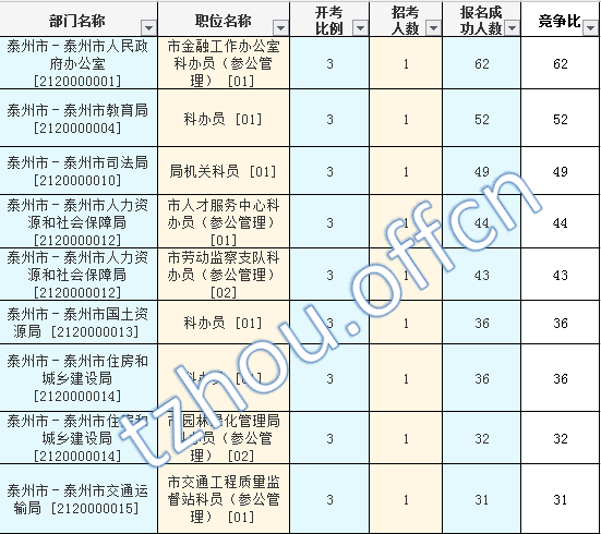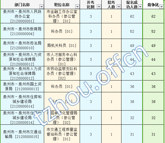 截至14日16時(shí),泰州城市報(bào)名人數(shù)最多的職位為:市金融工作辦公室科辦員(參公管理) [01],一共有62人報(bào)名,競(jìng)爭(zhēng)最激烈的職位為泰州市-泰州市人民政府辦公室 [2120000001]市金融工作辦公室科辦員(參公管理) [01],招錄1人,報(bào)名人數(shù)為62人,報(bào)名通過(guò)審核人數(shù)前十的職位主要集中在泰州市-泰州市人民政府辦公室 [2120000001]、泰州市-泰州市教育局 [2120000004]]、泰州市-泰州市司法局 [2120000010],具體信息如下: