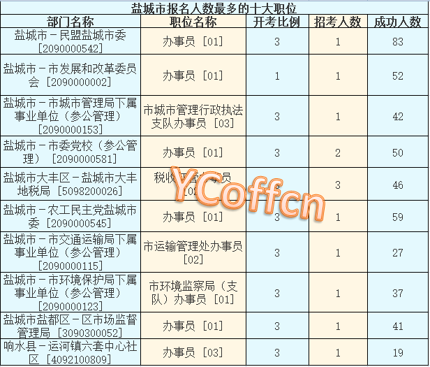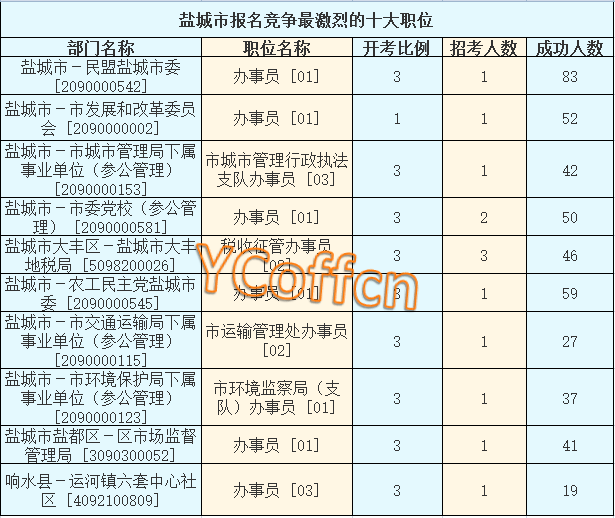 截至15日16時(shí),鹽城市報(bào)名人數(shù)最多的職位為:辦事員 [01],一共有60名,競爭最激烈的職位為辦事員 [01],招錄1人,報(bào)名人數(shù)為83,報(bào)名通過審核人數(shù)前十的職位主要集中在在鹽城市-市發(fā)展和改革委員會(huì) [2090000002]、鹽城市-市城市管理局下屬事業(yè)單位(參公管理) [2090000153]、鹽城市-市委黨校(參公管理) [2090000581],具體信息如下: