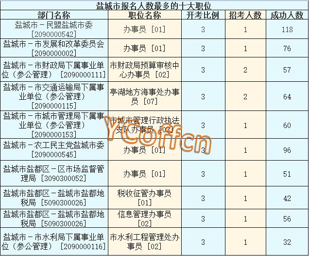 截至16日16時,鹽城市報名人數(shù)最多的職位為:鹽城市-明盟鹽城市委-辦事員 [01],一共有118名,競爭最激烈的職位為鹽城市-市委黨校辦事員 [01],招錄2人,報名人數(shù)為71,報名通過審核人數(shù)前十的職位主要集中在在鹽城市-市發(fā)展和改革委員會 [2090000002]、鹽城市-市城市管理局下屬事業(yè)單位(參公管理) [2090000153]、鹽城市-市委黨校(參公管理) [2090000581]
