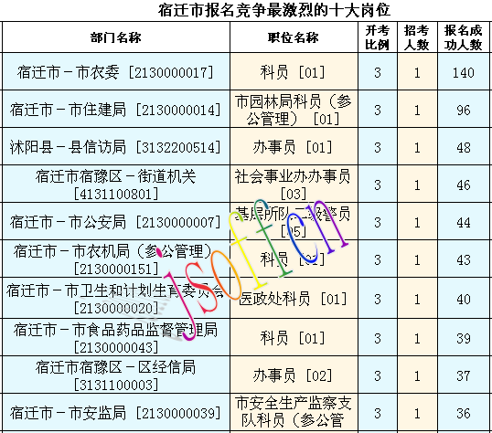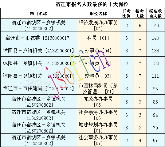 截至16日16時(shí),宿遷市報(bào)名人數(shù)最多的職位為:宿遷市宿城區(qū)-鄉(xiāng)鎮(zhèn)機(jī)關(guān) [4130200802],一共有143人報(bào)名,競(jìng)爭(zhēng)最激烈的職位為宿遷市-市農(nóng)委 [2130000017],招錄1人,報(bào)名人數(shù)為140人,報(bào)名通過審核人數(shù)前十的職位主要集中在宿遷市宿城區(qū)-鄉(xiāng)鎮(zhèn)機(jī)關(guān) [4130200802]、宿遷市-市農(nóng)委 [2130000017],具體信息如下:
