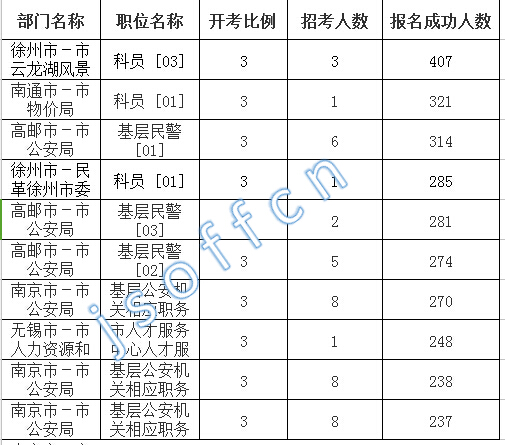 截至16日16時,江蘇省報名人數(shù)最多的職位為:徐州市-市云龍湖風景名勝區(qū)行政執(zhí)法大隊(參公管理) [2030000101]、科員 [03],一共有407人報名,競爭最激烈的職位為南通市-市物價局 [2060000048] 、科員 [01],招錄1人,報名人數(shù)為321人,報名通過審核人數(shù)前十的職位主要集中在南京市公安局、南通市物價局、高郵市-市公安局等部門,具體信息如下: 江蘇省報名人數(shù)最多十大崗位