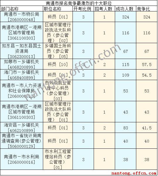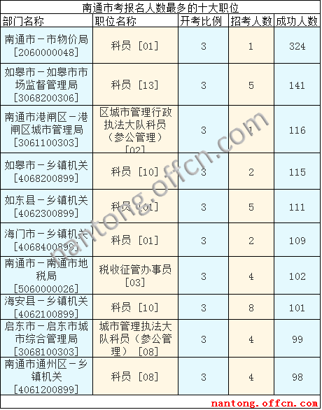 截至16日16時(shí),南通市報(bào)名人數(shù)最多的職位為:科員 [01],一共有324人報(bào)名,競(jìng)爭(zhēng)最激烈的職位為也是這個(gè)報(bào)名最多的科員[01],招錄1人,報(bào)名人數(shù)為324人,報(bào)名通過審核人數(shù)前十的職位比較集中,主要是南通市區(qū)和縣區(qū)鄉(xiāng)鎮(zhèn)機(jī)關(guān),如南通市-市物價(jià)局[2060000048]、如皋市-鄉(xiāng)鎮(zhèn)機(jī)關(guān)[4068200899],具體信息如下: