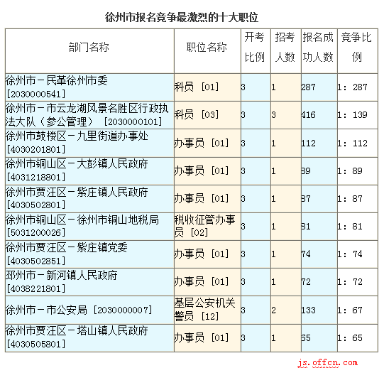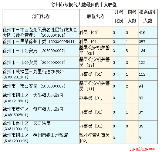 截至16日16時,徐州市報名人數(shù)最多的職位為:科辦員 [03],一共有416人報名,競爭最激烈的職位為科辦員 [01],招錄1人,報名人數(shù)為287人,報名通過審核人數(shù)前十的職位主要集中在徐州市-市云龍湖風(fēng)景名勝區(qū)行政執(zhí)法大隊(參公管理) [2030000101]、徐州市-民革徐州市委 [2030000541],具體信息如下: