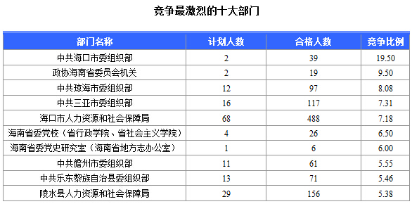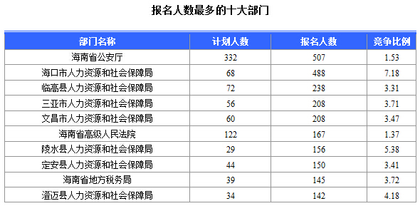 報名通過審核人數(shù)前十的職位主要集中在海南省高級人民法院、??谑腥肆Y源和社會局、海南省林業(yè)廳,具體信息如下: