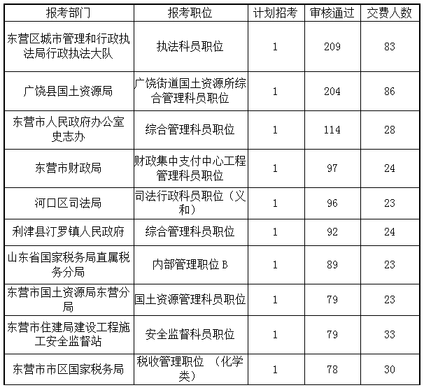 下面是今日報名審核通過最多和繳費人數(shù)最多的前十個職位,供各位考生參考。同時仍有7個職位無人通過審核,大家可以理性選擇報考。