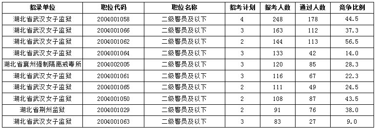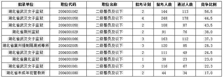 截止25日18時(shí),2016年湖北公務(wù)員考試省監(jiān)獄、戒毒系統(tǒng)140個(gè)職位共招錄357人,報(bào)考人數(shù)達(dá)到4085人,通過審核人數(shù)2574人,平均競爭比為7.2:1,所有職位均有人報(bào)考,5個(gè)職位無人通過審核。