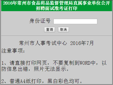 2016江蘇常州市食品藥品監(jiān)督管理局直屬事業(yè)單位招聘面試準(zhǔn)考證打印入口
