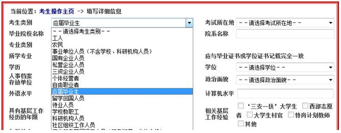 請仔細閱讀《報考指南》,確定自己的考生類別。“考生類別”這里不是指考生要參加的公務(wù)員類別,而是指當前的身份狀態(tài)。比如你現(xiàn)在在私企工作,那就應(yīng)該選填私營企業(yè)人員。