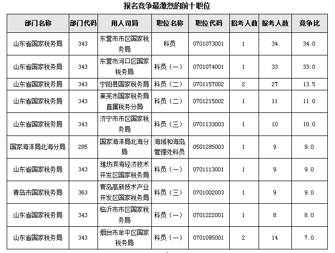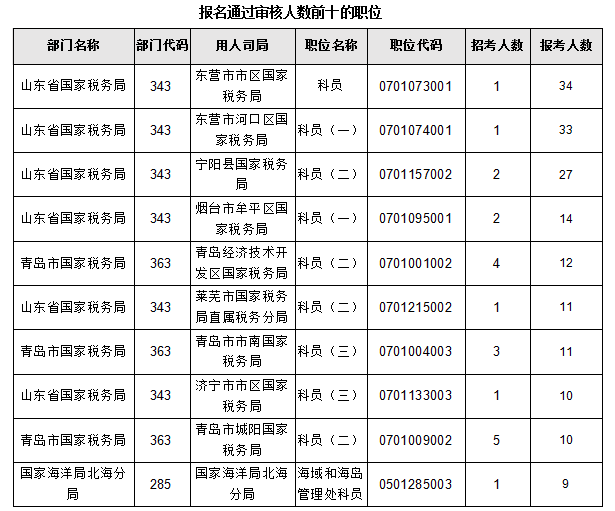 報(bào)名通過(guò)審核人數(shù)前十的職位由山東省國(guó)家稅務(wù)局包攬了9成,從首日?qǐng)?bào)名情況來(lái)看,國(guó)稅依然為最搶手的部門(mén)。