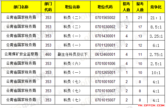 報(bào)名通過審核人數(shù)前十的職位主要集中在云南省國(guó)家稅務(wù)局、云南煤礦安全監(jiān)察局,具體信息如下: