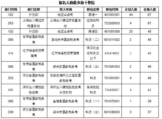 報(bào)名首日的人氣前十榜單涵蓋了外交部、國(guó)稅、出入境邊防檢查總站、遼寧儲(chǔ)備物資管理局等各個(gè)部門,其中,外交部地區(qū)業(yè)務(wù)司英語(yǔ)一(職位代碼401001001),上海出入境邊防檢查總站邊檢站科員(職位代碼723263003)這兩個(gè)職位目前均擁有了67個(gè)“粉絲”,可謂首日的“人氣雙星”,外交部地區(qū)業(yè)務(wù)司英語(yǔ)一(職位代碼401001001)這一職位招錄44人,規(guī)模較大,且英語(yǔ)屬于大語(yǔ)種,符合條件的考生較多。