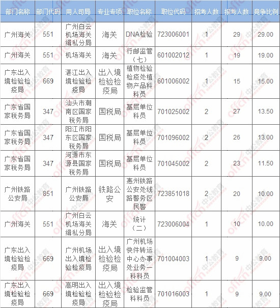 截止到15日16時(shí),競爭比例的職位為廣州海關(guān)廣州白云機(jī)場海關(guān)緝私分局DNA檢驗(yàn)一職,招錄1人,截止到15日16時(shí)通過人數(shù)為29人。