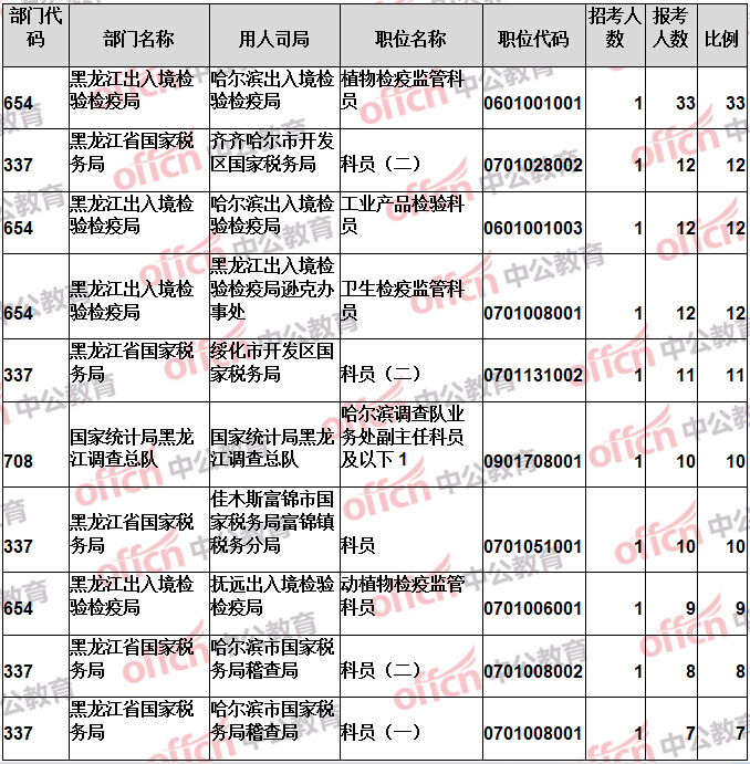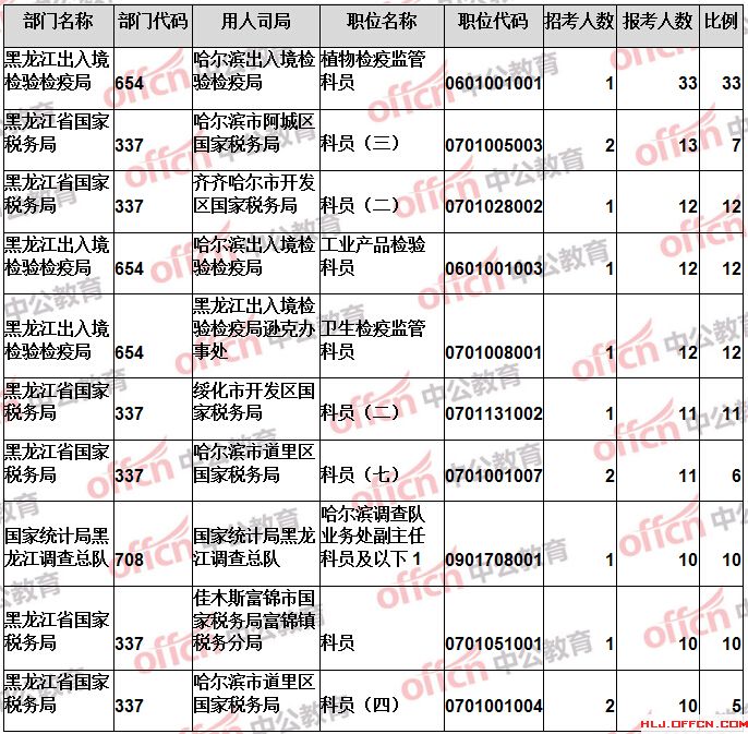 報名通過審核人數(shù)前十的職位主要集中在黑龍江出入境檢驗(yàn)檢疫局、黑龍江省國家稅務(wù)局、國家統(tǒng)計局黑龍江調(diào)查總隊等部門,具體信息如下: