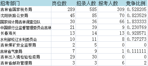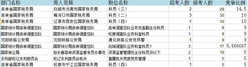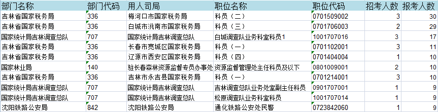 報(bào)名通過審核人數(shù)前十的職位主要集中在吉林省國稅局和國家統(tǒng)計(jì)局吉林調(diào)查總隊(duì),具體信息如下: