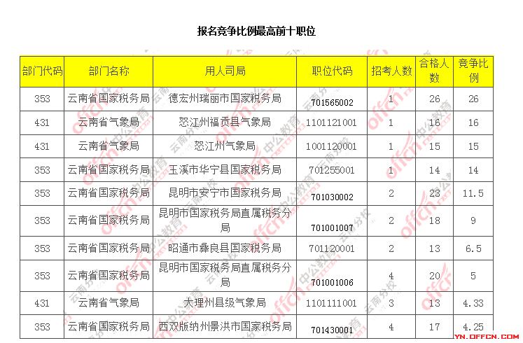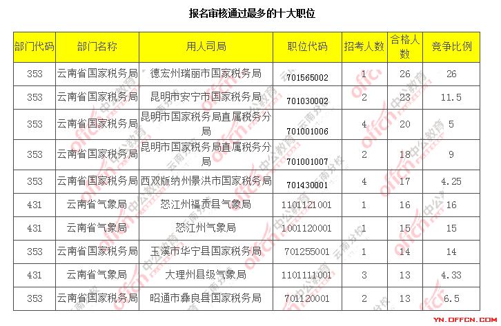 報(bào)名通過審核人數(shù)前十的職位主要集中在云南省國家稅務(wù)局、云南氣象局,具信息如下: