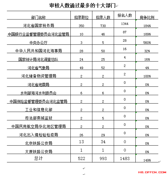截止到16日8時(shí),通過審核人數(shù)前三位的部門依次是:河北省國(guó)家稅務(wù)局、中國(guó)銀行業(yè)監(jiān)督管理委員會(huì)河北監(jiān)管局、中央辦公廳,三部門通過審核總?cè)藬?shù)達(dá)1459人,占通過審核總?cè)藬?shù)的98.3%。
