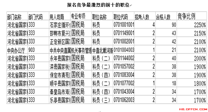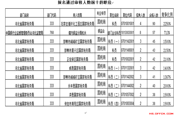 報名通過審核人數(shù)前十的職位主要集中在河北省國家稅務局、中國銀行業(yè)監(jiān)督管理委員會河北監(jiān)管局、中央辦公廳等部門,具體信息如下: