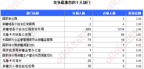 為幫助廣大考生更清晰的了解今日報名情況,新疆中公網(wǎng)校整理了審核通過人數(shù)前十位的部門以及競爭比例最激烈的十大部門,供廣大考生參考: