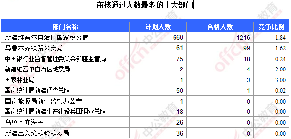 截止到16日16時,通過審核人數(shù)前三位的部門依次是:新疆維吾爾自治區(qū)國家稅務(wù)局、烏魯木齊鐵路公安局、中國銀行業(yè)監(jiān)督管理委員會新疆監(jiān)管局,三部門通過審核總?cè)藬?shù)達(dá)1333人,占通過審核總?cè)藬?shù)的99%。