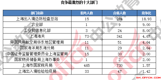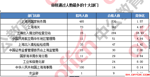 為幫助廣大考生更清晰的了解今日?qǐng)?bào)名情況,上海中公網(wǎng)校整理了審核通過(guò)人數(shù)前十位的部門(mén)以及競(jìng)爭(zhēng)比例最激烈的十大部門(mén),供廣大考生參考: