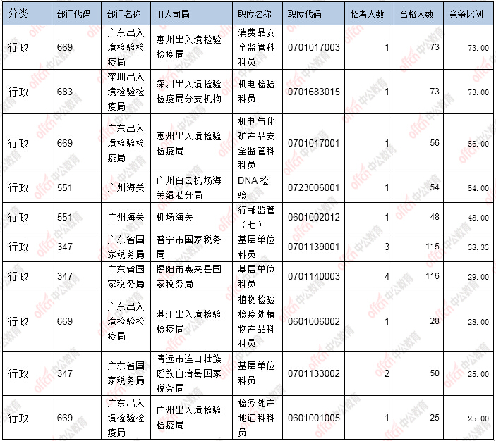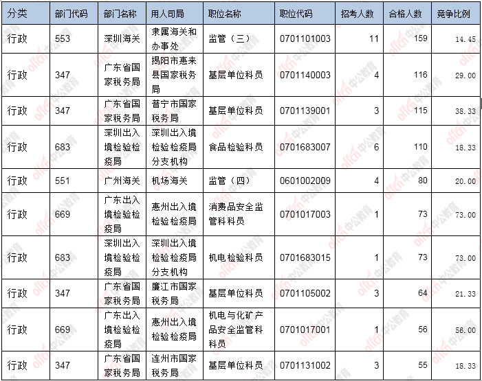 報(bào)名通過審核人數(shù)前十的職位主要集中在廣東國稅局、廣州海關(guān)、深圳海關(guān)等部門,具體信息如下: