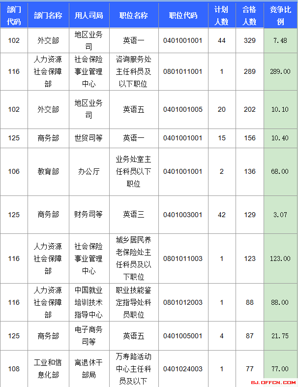 合格人數(shù)前十的職位主要集中在外交部、人力資源社會(huì)局、商務(wù)部等部門,具體信息如下: