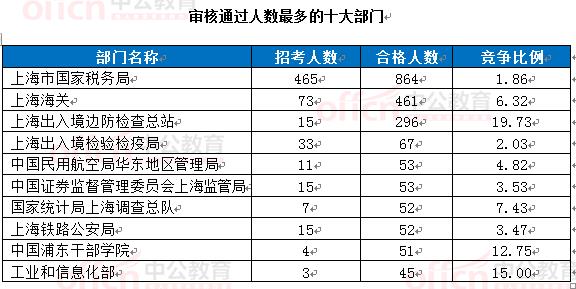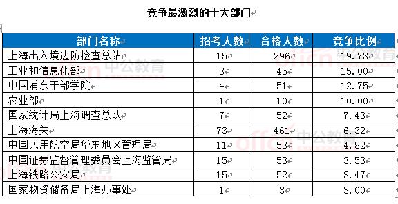 為幫助廣大考生更清晰的了解今日報名情況,上海中公網校整理了審核通過人數前十位的部門以及競爭比例最激烈的十大部門,供廣大考生參考: