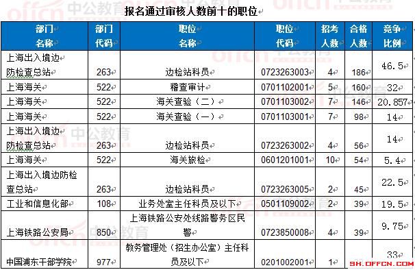 報名通過審核人數前十的職位主要集中在上海出入境邊防檢查總站、上海海關、工業(yè)和信息化部等部門,具體信息如下: