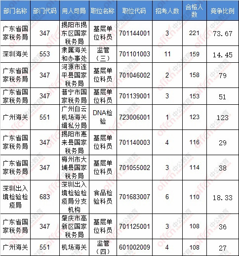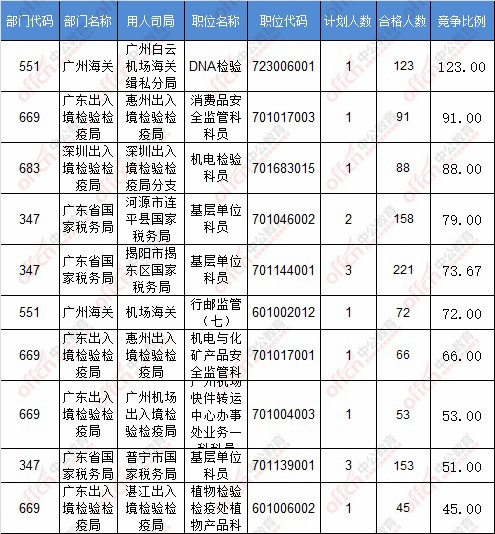 截止到17日8時,競爭比例的職位為廣州海關(guān)廣州白云機(jī)場海關(guān)緝私分局DNA檢驗(yàn)一職,招錄1人,截止到17日8時通過人數(shù)為123人。