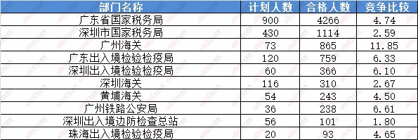 報名通過審核人數(shù)前十的職位主要集中在廣州海關(guān)、廣東出入境檢驗(yàn)檢疫局、深圳出入境檢驗(yàn)檢疫局等部門,具體信息如下: