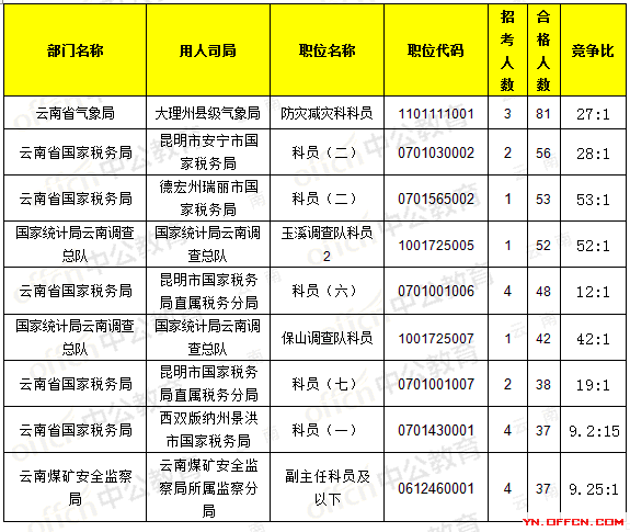 截止17日8時,招錄比例的職位為云南省國家稅務(wù)局,職位代碼是1101111001,招錄3人,通過人數(shù)81人,競爭比27:1 。