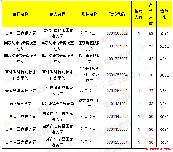 報名通過審核人數(shù)前十的職位主要集中在云南省國家稅務(wù)局、云南煤礦安全監(jiān)察局,具體信息如下: