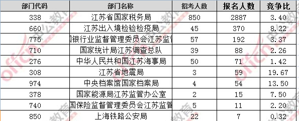 為幫助廣大考生更清晰的了解今日報名情況,江蘇中公教育整理了審核通過人數(shù)前十位的部門以及競爭比例最激烈的十大部門,供廣大考生參考: