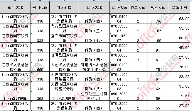 報名通過審核人數(shù)前十的職位主要集中在江蘇省國家稅務(wù)局、江蘇省地震局,具體信息如下: