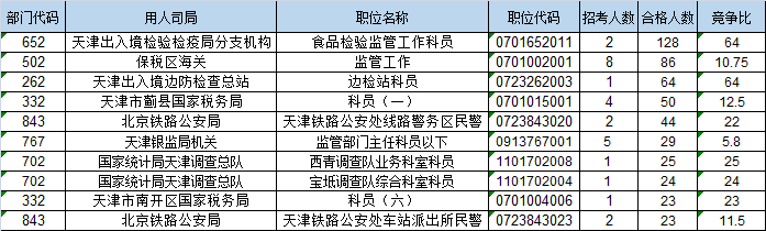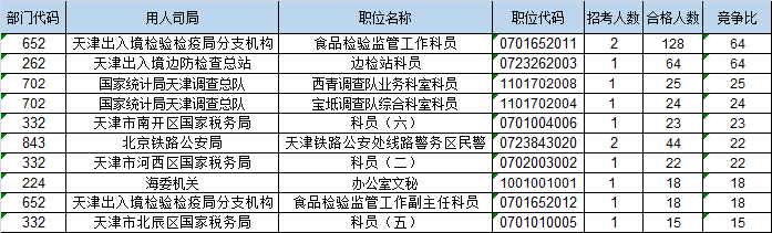 截止到17日16時,競爭比例的職位為天津出入境檢驗檢疫局分支機構(gòu)食品檢驗監(jiān)管工作科員一職,招錄2人,截止到17日16時通過人數(shù)為128人。