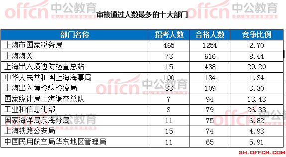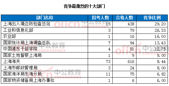 為幫助廣大考生更清晰的了解今日報名情況,上海中公教育整理了審核通過人數(shù)前十位的部門以及競爭比例最激烈的十大部門,供廣大考生參考: