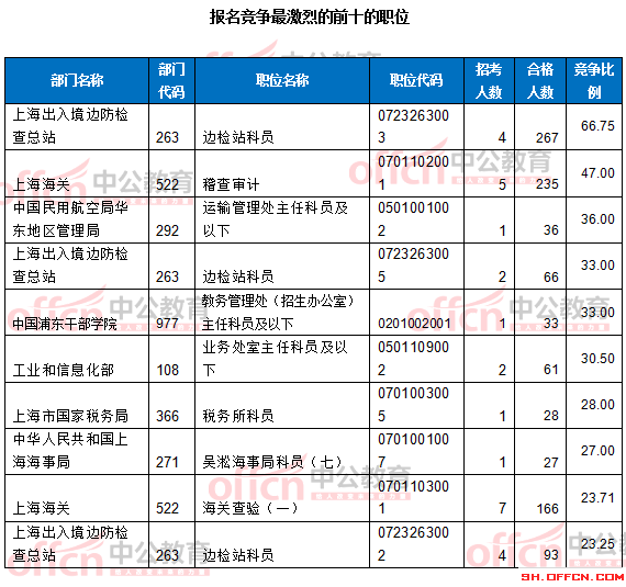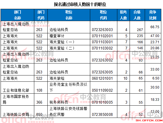 報名通過審核人數(shù)前十的職位主要集中在上海出入境邊防檢查總站、上海海關(guān)、工業(yè)和信息化部,具體信息如下: