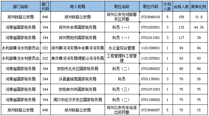 報名通過審核人數(shù)排名前列的職位主要集中在鄭州鐵路公安局、河南省國家稅務(wù)局,水利部黃河水利委員會,具體信息如下: