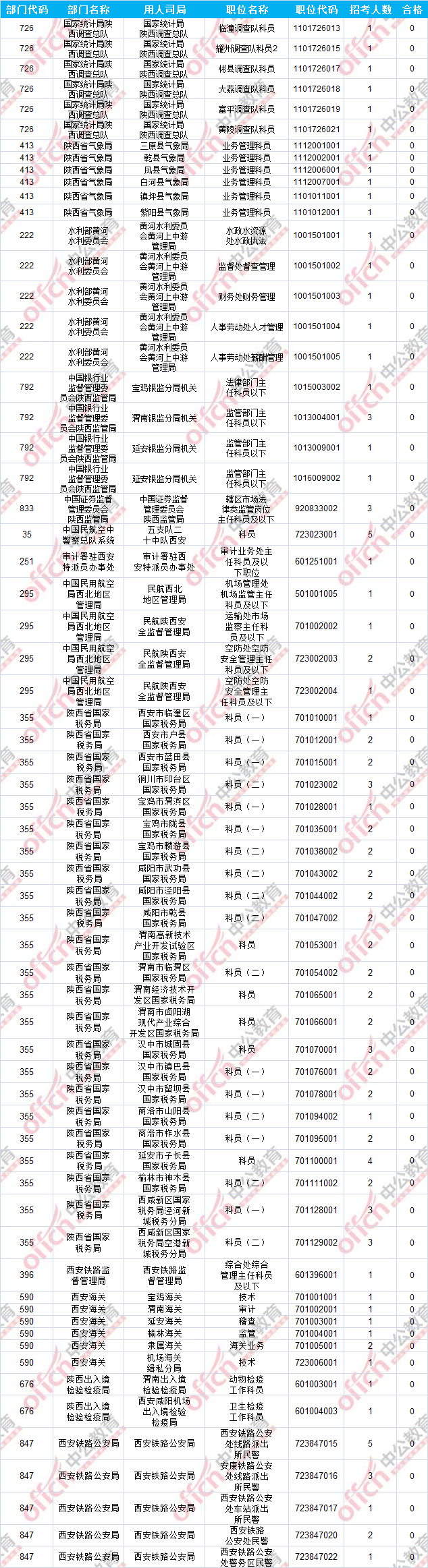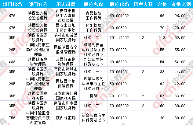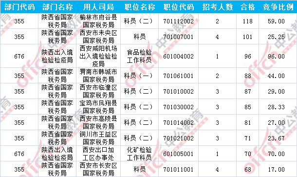 報(bào)名通過(guò)審核人數(shù)前十的職位主要集中在陜西省國(guó)家稅務(wù)局及陜西出入境檢驗(yàn)檢疫局兩大部門,具體信息如下:
