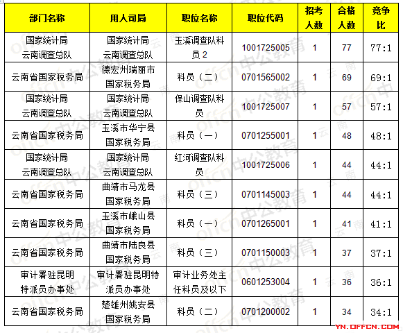 截止17日16時,競爭最激烈的職位為國家統(tǒng)計局云南調(diào)查總隊_國家統(tǒng)計局云南調(diào)查總隊(玉溪調(diào)查隊科員2),招錄1人,通過人數(shù)為77人,77:1。