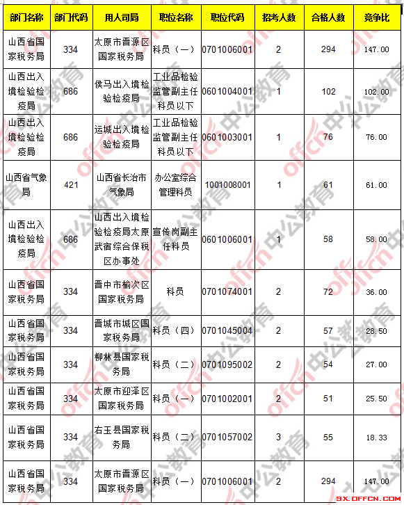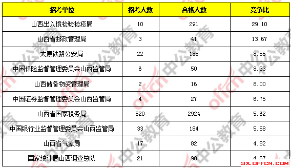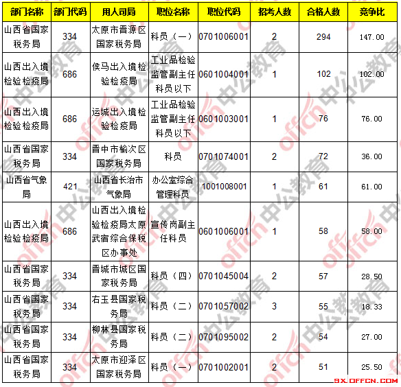 報考人數(shù)前十的職位主要集中在山西省國家稅務局、山西出入境檢驗檢疫局這兩個部門,具體信息如下: