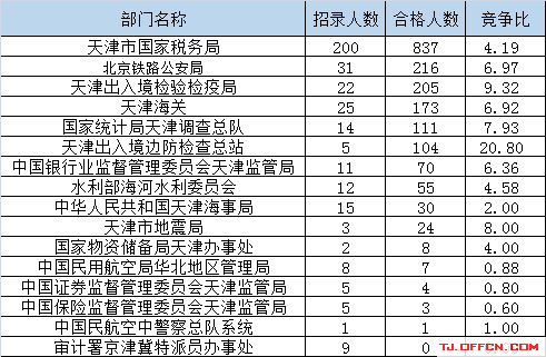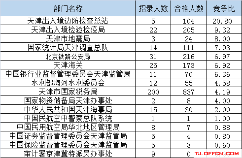 為幫助廣大考生更清晰的了解今日報名情況,天津中公網校整理了審核通過人數(shù)前五位的部門以及競爭比例最激烈的五大部門,供廣大考生參考: